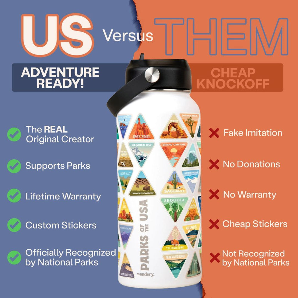 Where have you travelled to? Wondery Outdoors has The Original Parks of the USA Bucket List Water Bottle keeps track of all your adventures and helps you stay hydrated. We've designed unique depictions of your favorite parks in a beautiful screen printing, along with vibrant corresponding stickers that will be sure to strike conversation on the trail, at work, or in the classroom. What better to commemorate your journeys than crossing parks off your bucket list? Stickers included!